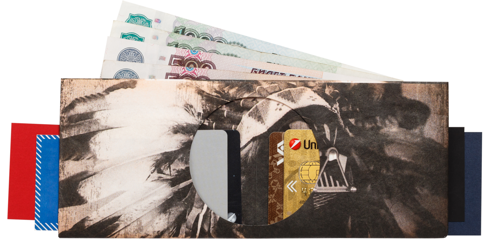 Перед нами — последний из Магикан, загадочный индеец, который, кажется, вышел прямо из исторических летописей. Но что-то здесь не так: вместе с традиционным головным убором его лицо скрывает маска Дарта Вейдера, а на обратной стороне кошелька - силуэт штурмовика из "Звездных войн".
