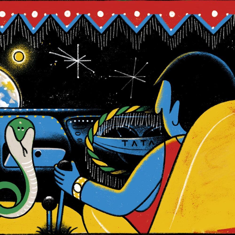Каждая деталь принта продумана до мелочей. Яркие цвета, характерные для Индии — насыщенный желтый, сочный розовый, глубокий синий — создают ощущение праздника и энергии. Аутентичные элементы, такие как гирлянды цветов, развевающиеся на зеркалах заднего вида, или кобра, которая как дрессированная смотрит и "ладошки" в жеста "Намасте"!