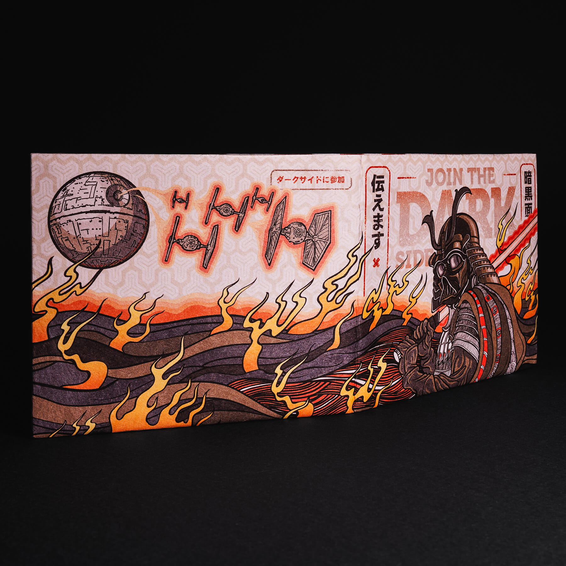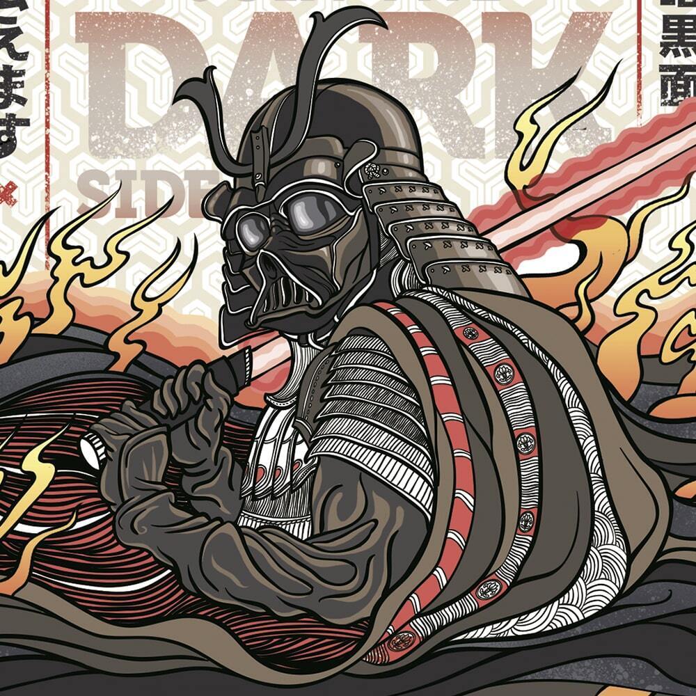 Перед нами — элегантное совмещение двух героев из разных эпох: древнего самурая и легендарного Дарта Вейдера. Этот дизайн символизирует связь между традициями и современностью, между прошлым и будущим.