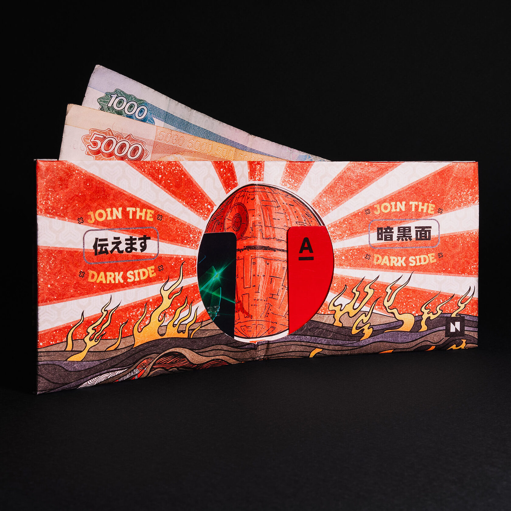 Этот дизайн — больше чем просто изображение. Он символизирует идею о том, что настоящее мастерство сочетает в себе легкость, силу и стиль. Как самурай, этот кошелек тонок, как лезвие катаны, легок, как дуновение ветра, и неубиваем, как отважный воин. А благодаря отсылкам к Дарту Вейдеру, он также становится символом мощи и технологичности, как вся Империя из "Звездных войн".