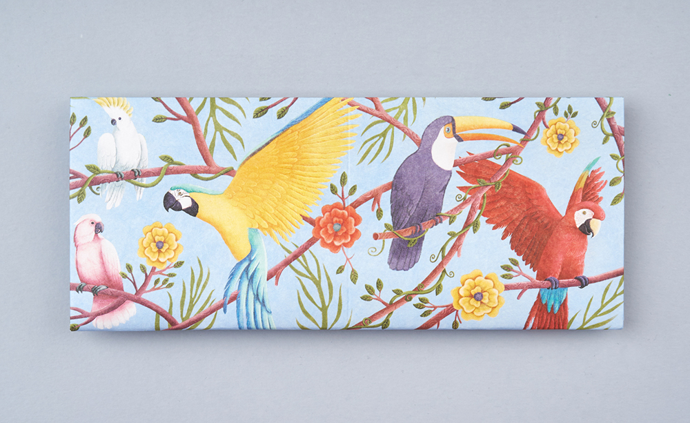 Новый принт под названием New Parrots — это больше, чем просто узор на поверхности кошелька. Это взрыв цвета, энергии и воображения. Яркие попугаи, словно только что спустившиеся с ветвей экзотических деревьев, парят среди причудливых листьев и бабочек с невероятными узорами на крыльях. Каждая деталь этого дизайна будто шепчет: "Жизнь — это приключение, а мир вокруг полон чудес."