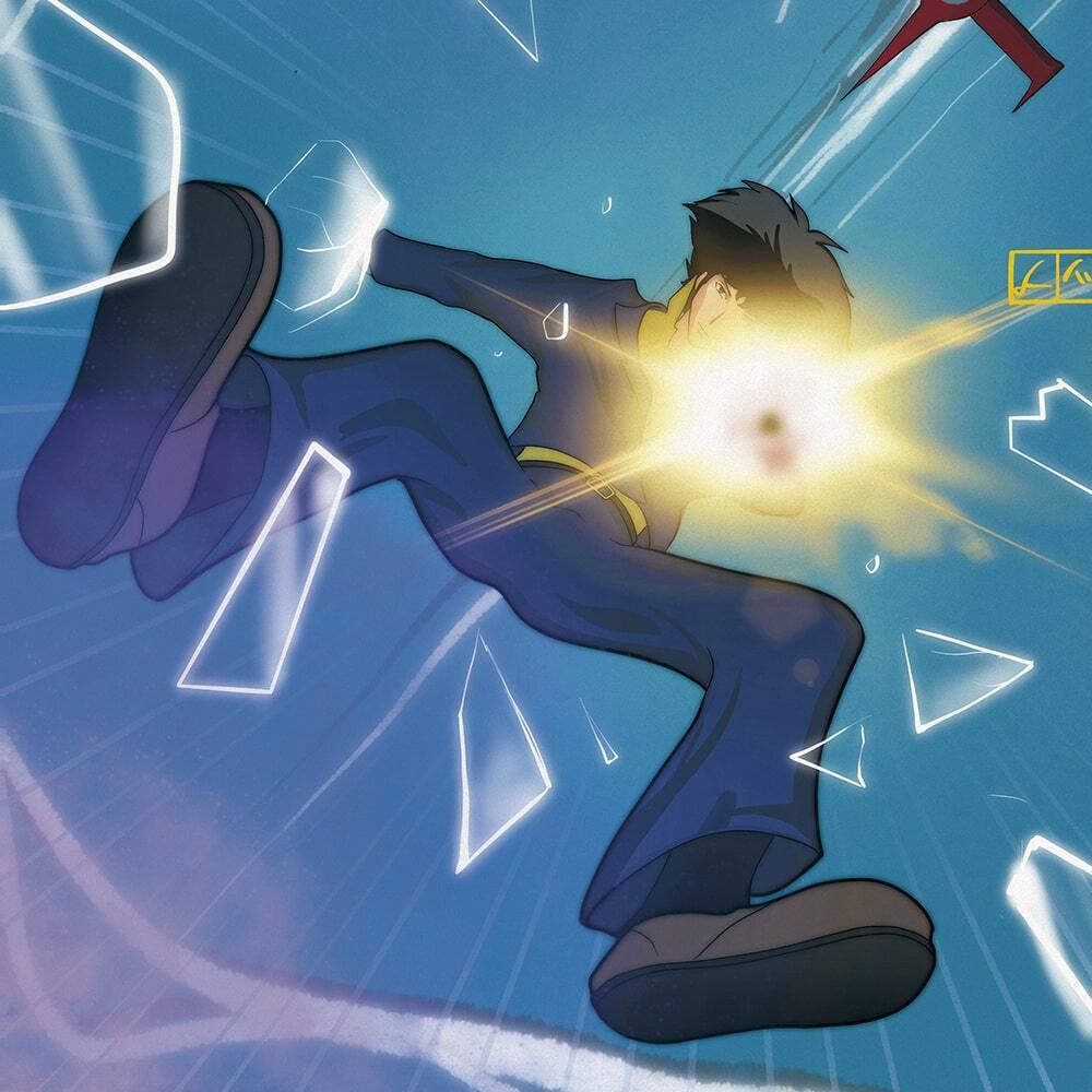 Принт New Bebop выполнен в небесных тонах — мягких голубых, серых и белых оттенках, которые напоминают облака и бескрайние просторы космоса. На переднем плане — Спайк Шпигель, парящий в воздухе с револьвером в руке. Его поза — это воплощение свободы и легкости, но в его глазах можно увидеть тень одиночества, которая преследует его на протяжении всего аниме. Фон словно растворяется в небе, создавая ощущение безграничности и вечного движения.